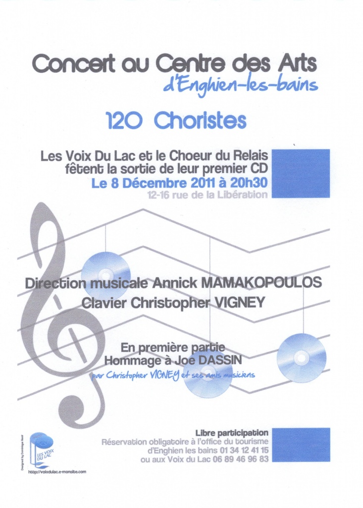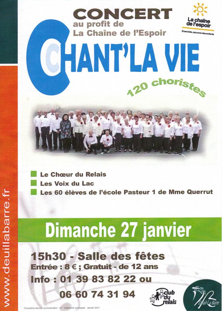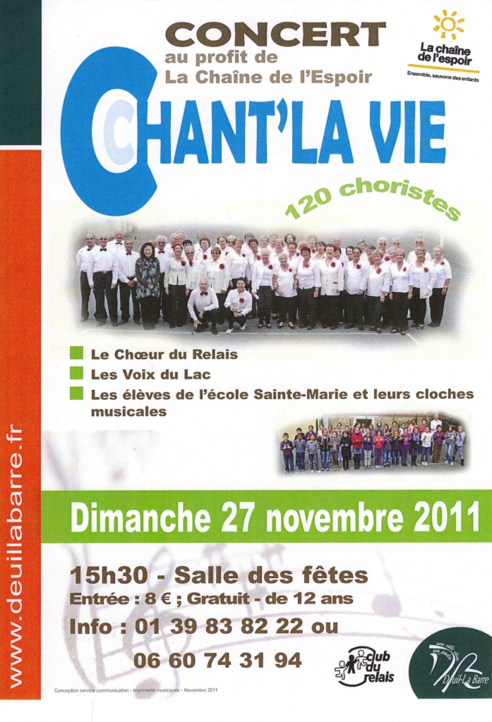 2011 - Chant' la vie à la Salle des fêtes de Deuil la Barre - Concert organisé par le Choeur du Relais, donné au profit de la "Chaine de l'espoir", avec Les voix du Lac et les voix d'enfants de l'école Pasteur1 de Deuil la Barre.En partenariat avec le groupe Handchimes de l'école de musique M .Cornet